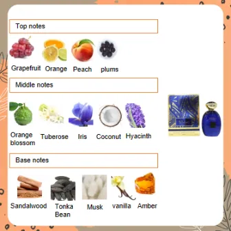 Perpaduan aroma jeruk dan buah segar di awal menciptakan kesan enerjik & cerah , sementara bunga dan kelapa memberi nuansa lembut nan romantis , ditutup dengan dasar kayu cendana dan amber yang hangat dan elegan.