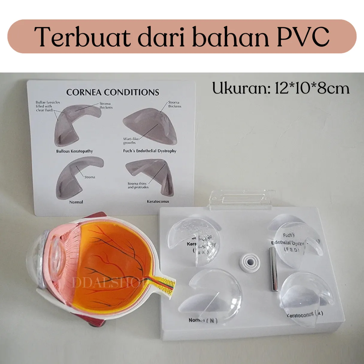 Alat Peraga Model Anatomi Bola Mata Manusia Cornea adalah media pembelajaran medis yang dirancang untuk membantu pelajar, mahasiswa kedokteran, maupun tenaga medis memahami struktur mata secara detail. Dibuat dari bahan PVC berkualitas tinggi, model ini memiliki ukuran 12 × 10 × 8 cm dengan detail anatomi yang jelas dan realistis.