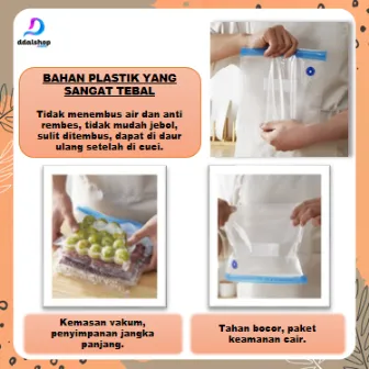 Vakum + Plastik Baju + Plastik Makanan – 1 unit vakum + 4 pcs plastik baju (S, M, L, XL) + 5 pcs plastik makanan.