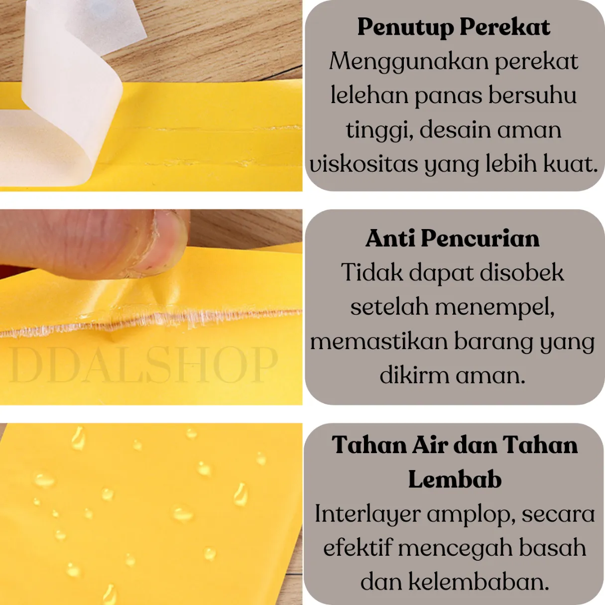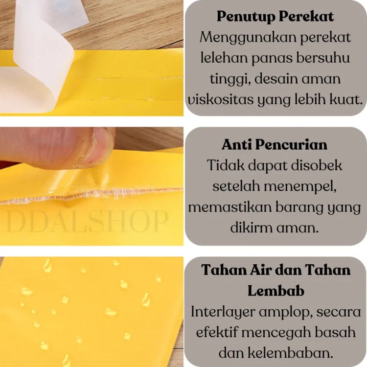 Dengan desain self-sealing yang praktis, Anda tidak perlu ribet menambah lem atau lakban. Cukup tutup bagian perekat, paket langsung siap dikirim. Warna coklat kekuningan memberi kesan rapi, profesional, sekaligus aman saat sampai di tangan pelanggan.
