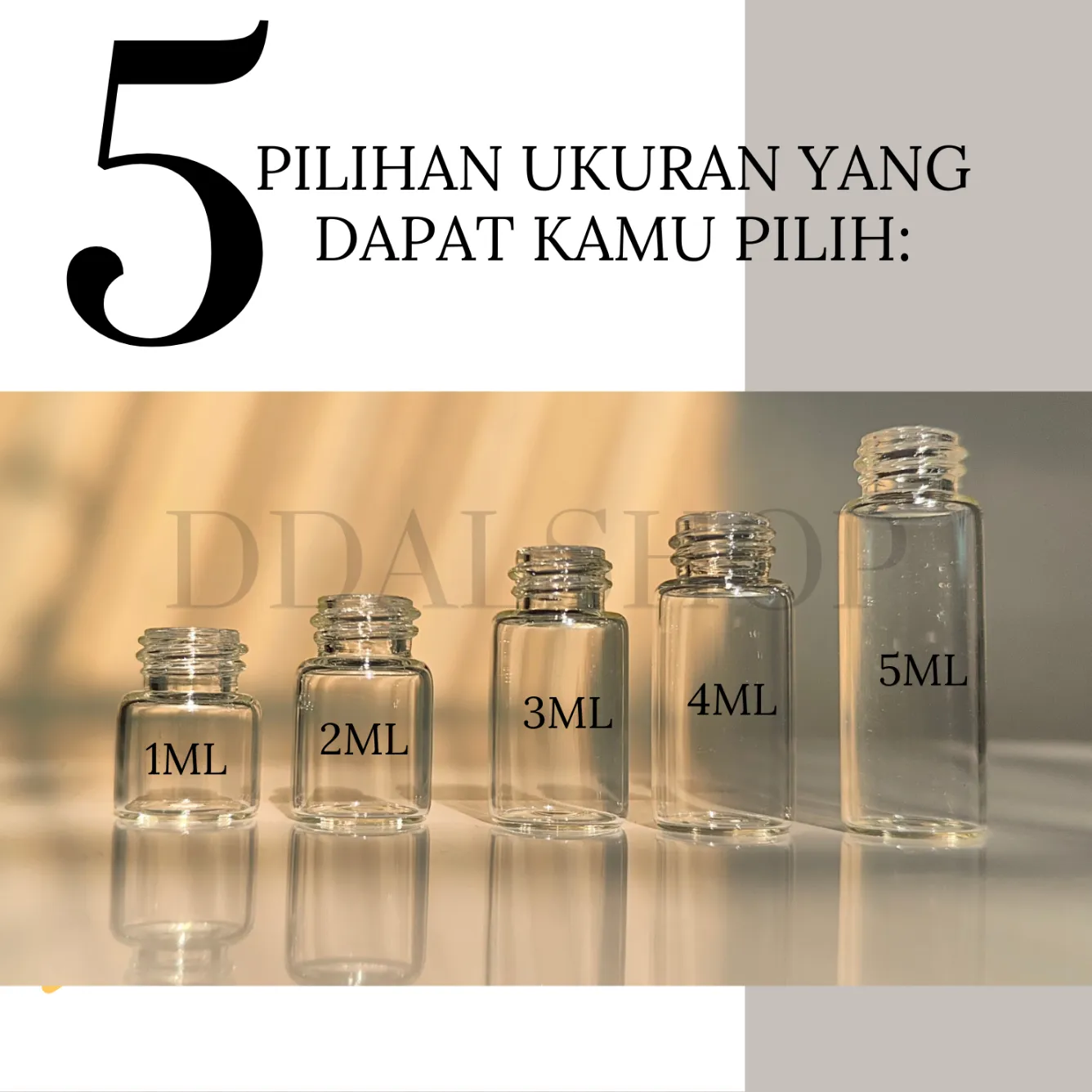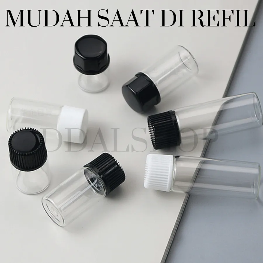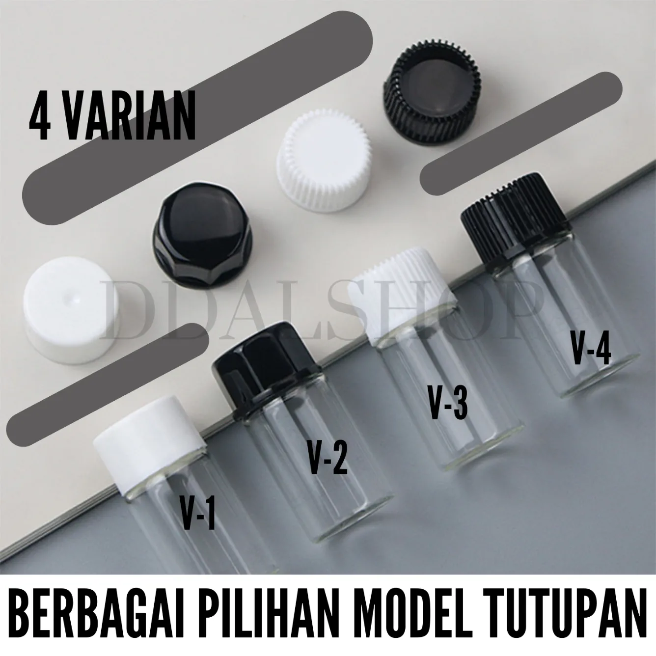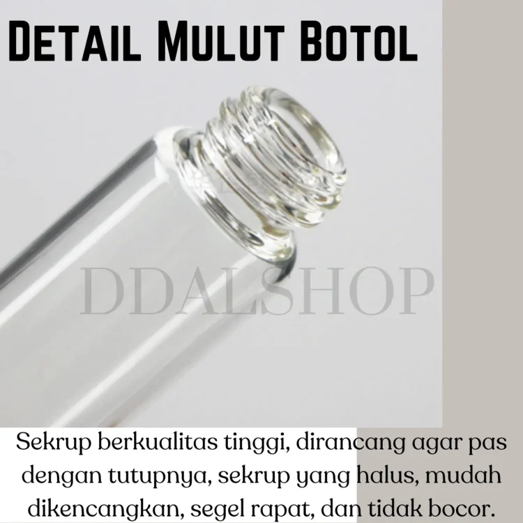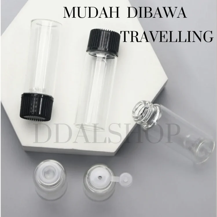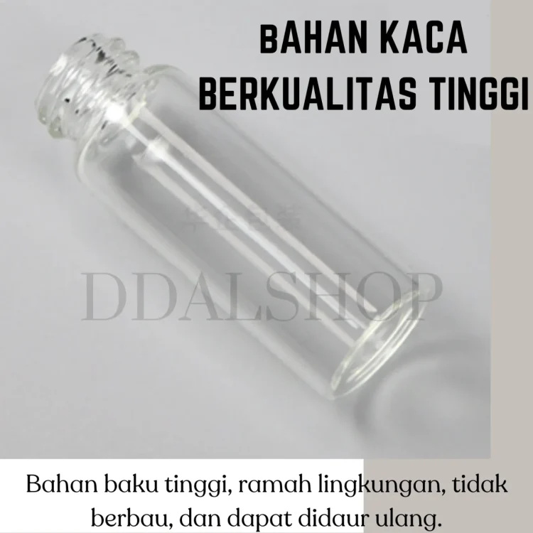 Desain kaca transparan memudahkan Anda melihat isi di dalamnya, serta memberikan kesan higienis dan premium. Botol kecil ini sangat cocok untuk kemasan sample skincare, tester kosmetik, oil essential, hingga kebutuhan medis. Ringkas, praktis, dan mudah dibawa ke mana saja.