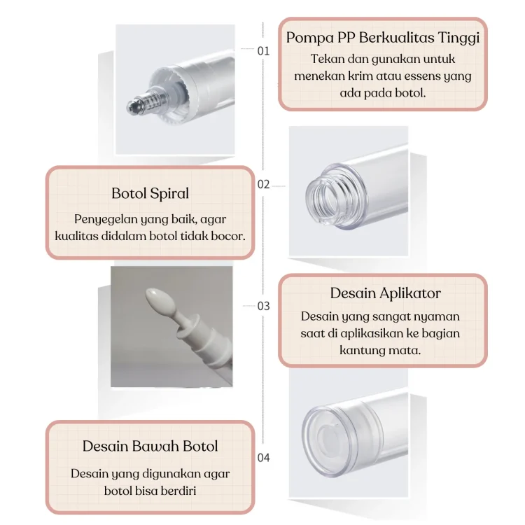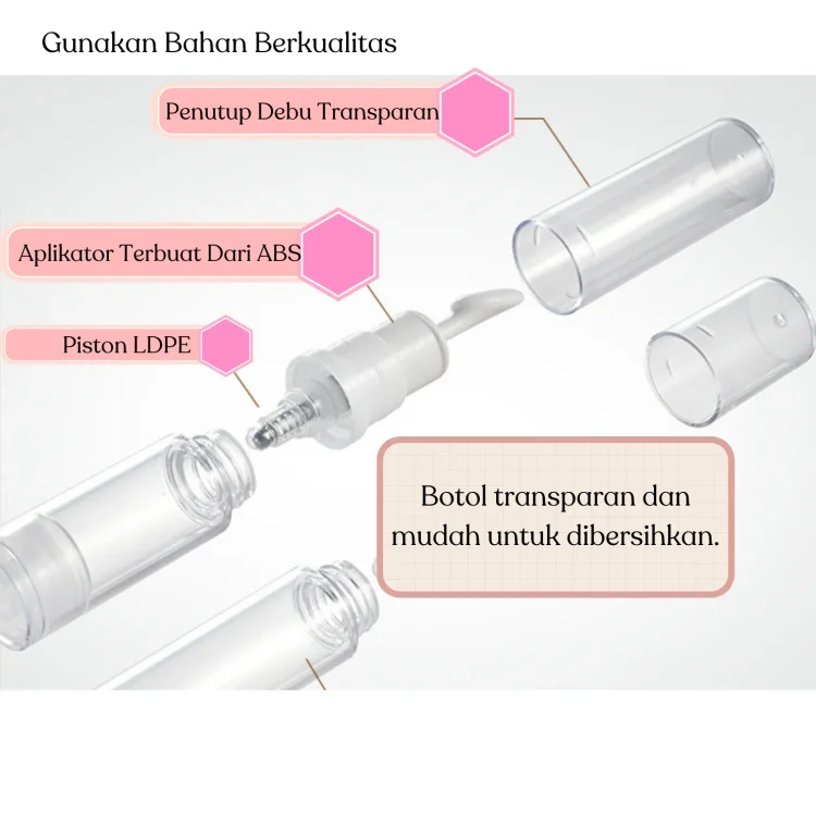 Botol Pump Airless Travel Bottle Mini hadir sebagai solusi praktis untuk menyimpan berbagai produk skincare dan kosmetik Anda, seperti lotion, minyak esensial, krim mata, pelembab, hingga pembersih wajah. Desain airless pump ini menjaga isi tetap higienis karena botol kedap udara, sehingga terhindar dari bakteri maupun kotoran yang dapat merusak kualitas produk.