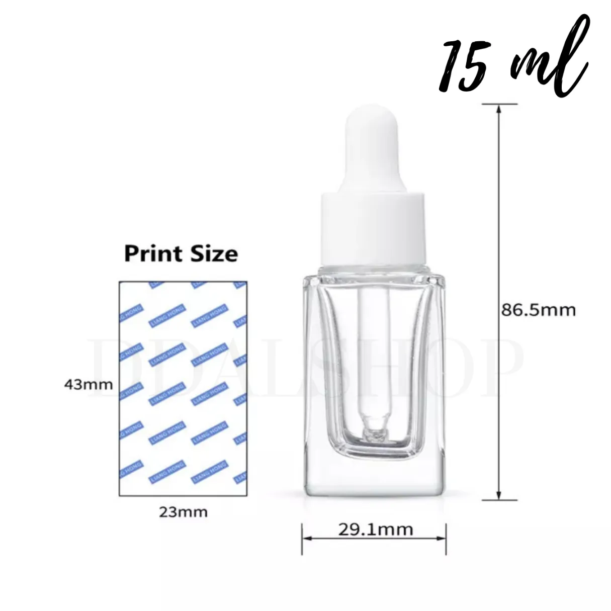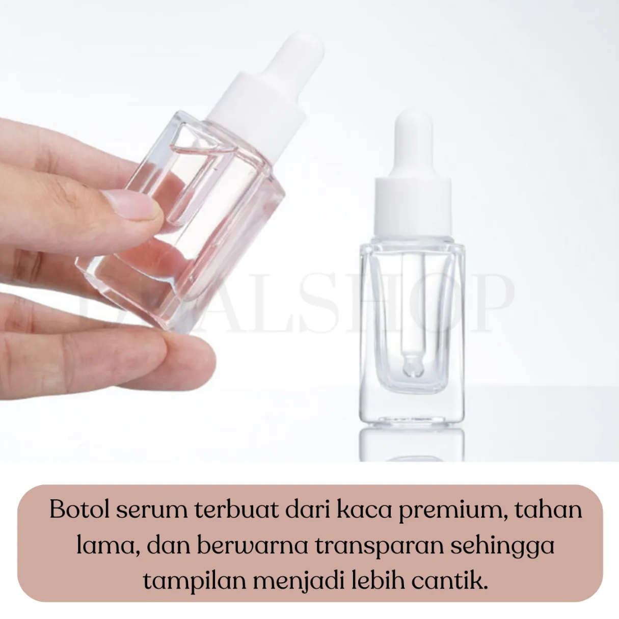Tersedia dalam ukuran 10ml, 15ml, dan 30ml, botol ini dilengkapi dengan pipet kaca serta tutup karet putih yang praktis dan higienis. Desain transparan memudahkan Anda melihat isi dan jumlah cairan di dalamnya, serta tampil estetik saat dipajang di rak skincare.