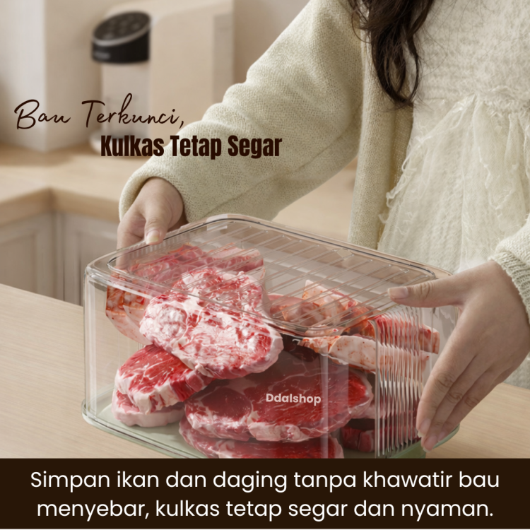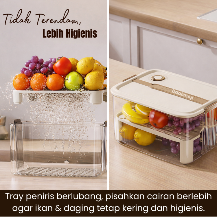 Dilengkapi tray peniris berlubang , cairan berlebih dari ikan atau daging akan terpisah ke bagian bawah sehingga bahan makanan tidak terendam udara dan tetap segar lebih lama. Desain Di antara memudahkan Anda melihat isi tanpa membuka tutup.