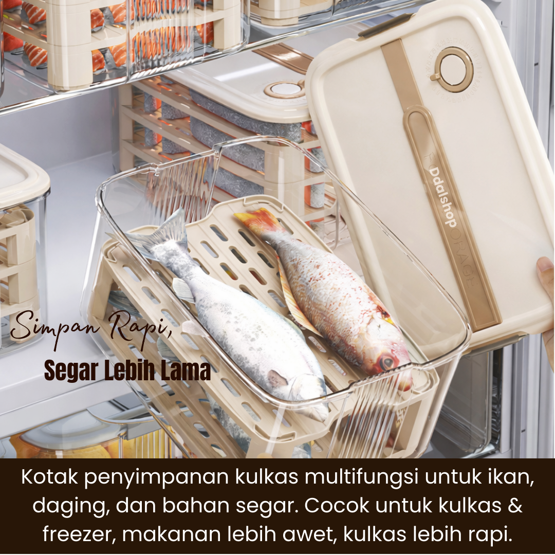Dilengkapi tray peniris berlubang , cairan berlebih dari ikan atau daging akan terpisah ke bagian bawah sehingga bahan makanan tidak terendam udara dan tetap segar lebih lama. Desain Di antara memudahkan Anda melihat isi tanpa membuka tutup.