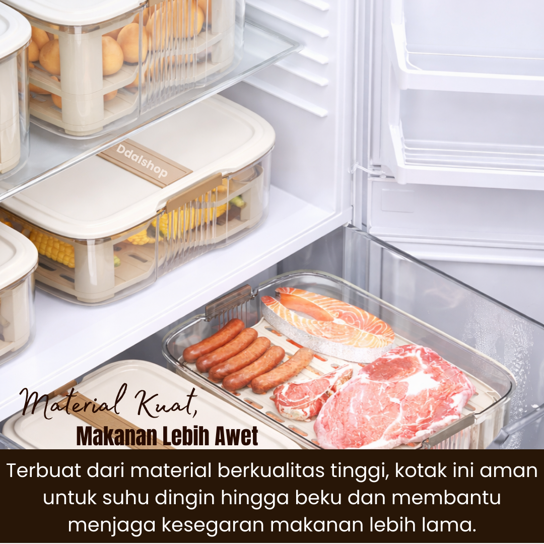 Box Penyimpanan Kulkas Food Grade Anti Bau Kedap Udara dengan Tray adalah solusi praktis untuk menjaga bahan makanan tetap segar, higienis, dan bebas bau di dalam kulkas maupun freezer. Organizer makanan ini dirancang khusus untuk menyimpan ikan, daging, seafood, buah, dan sayuran agar tidak tercampur aroma serta lebih tahan lama.