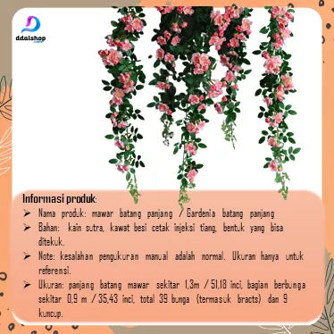 Dengan panjang total 1,3 meter (0,9 meter bagian berbunga), bunga rambat ini dihiasi hingga 39 bunga mawar lengkap dengan kuncup dan 37 bunga gardenia dengan 12 kuncup, sehingga terlihat sangat penuh, mewah, dan natural. Batangnya bisa ditekuk sesuai kebutuhan, memudahkan Anda dalam menata dekorasi di dinding, balkon, ruang tamu, pelaminan, hingga hiasan pohon mati.