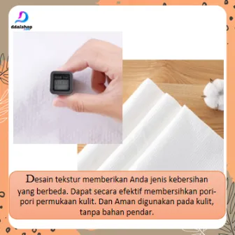 Terbuat dari kain spunlace katun pilihan (bukan tenunan) yang halus, lembut, dan ramah kulit. Memiliki daya serap tinggi, tidak mudah robek, bebas serabut, serta aman digunakan pada kulit sensitif.