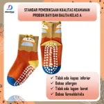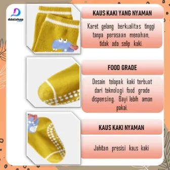 Bagian telapak kaki dilengkapi teknologi anti slip food grade yang aman untuk bayi dan anak-anak, mencegah terpeleset di lantai licin. Karet gelangnya elastis dan lembut, tidak menekan kaki, sehingga nyaman digunakan sepanjang hari.