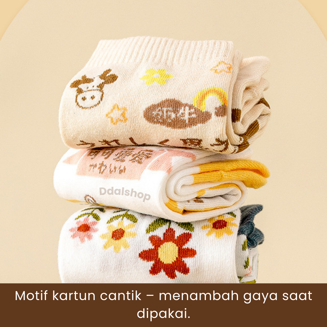 Motif kartun yang lucu dan modern menjadikan kaus kaki ini tidak hanya nyaman, tetapi juga menunjang gaya sehari-hari. Cocok digunakan untuk aktivitas harian, olahraga ringan, atau bersantai di rumah.
