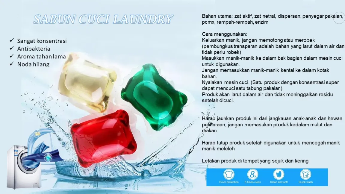 Buat kegiatan mencuci lebih praktis dan anti ribet dengan Manik-Manik Deterjen Konsentrat yang mampu membersihkan pakaian hingga ke serat terdalam. Satu manik kecil ini sudah mengandung cairan pencuci + pelembut + desinfektan sehingga menciptakan fungsi 3-in-1 yang efektif dan hemat. Tinggal masukkan manik ke dalam air atau mesin cuci, lalu tambahkan pakaian Anda—tanpa perlu membuka bungkus, tanpa perlu menuang cairan!