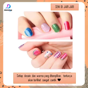 Produk ini memiliki 8 stiker nail art berperekat, masing-masing berisi ±5 motif, sehingga total terdapat 40 pilihan pola lucu. Mulai dari warna cerah, motif karakter, hingga desain glitter yang membuat kuku terlihat seperti manicure salon sungguhan.