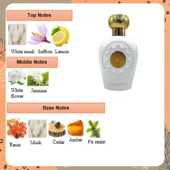 Parfum ini memancarkan pesona feminin dari kombinasi white musk, saffron, dan lemon yang segar di awal, berpadu dengan aroma white flower dan jasmine yang menenangkan di tengah, serta diakhiri dengan resin, cedar, amber, dan fir resin yang hangat dan sensual.
