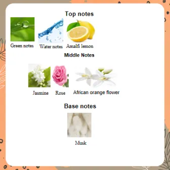 Perpaduan top notes green notes, water notes, dan amalfi lemon, disusul aroma bunga melati, african orange flower, dan mawar yang feminin, serta ditutup dengan sentuhan musk yang lembut – menjadikan parfum ini pilihan sempurna untuk wanita muda yang energik, romantis, dan menyukai petualangan.