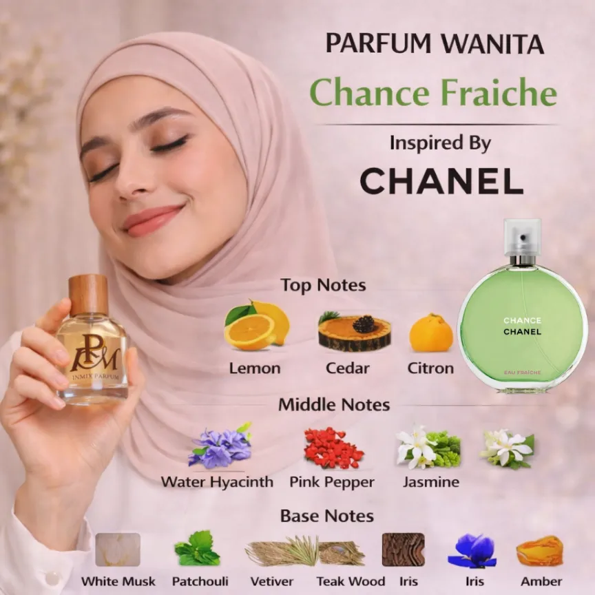 Wangi yang lembut, mewah, dan menyegarkan — Parfum INMIX Inspired by Chance Eau Fraîche siap menemani setiap langkahmu dengan pesona feminin yang tak terlupakan.