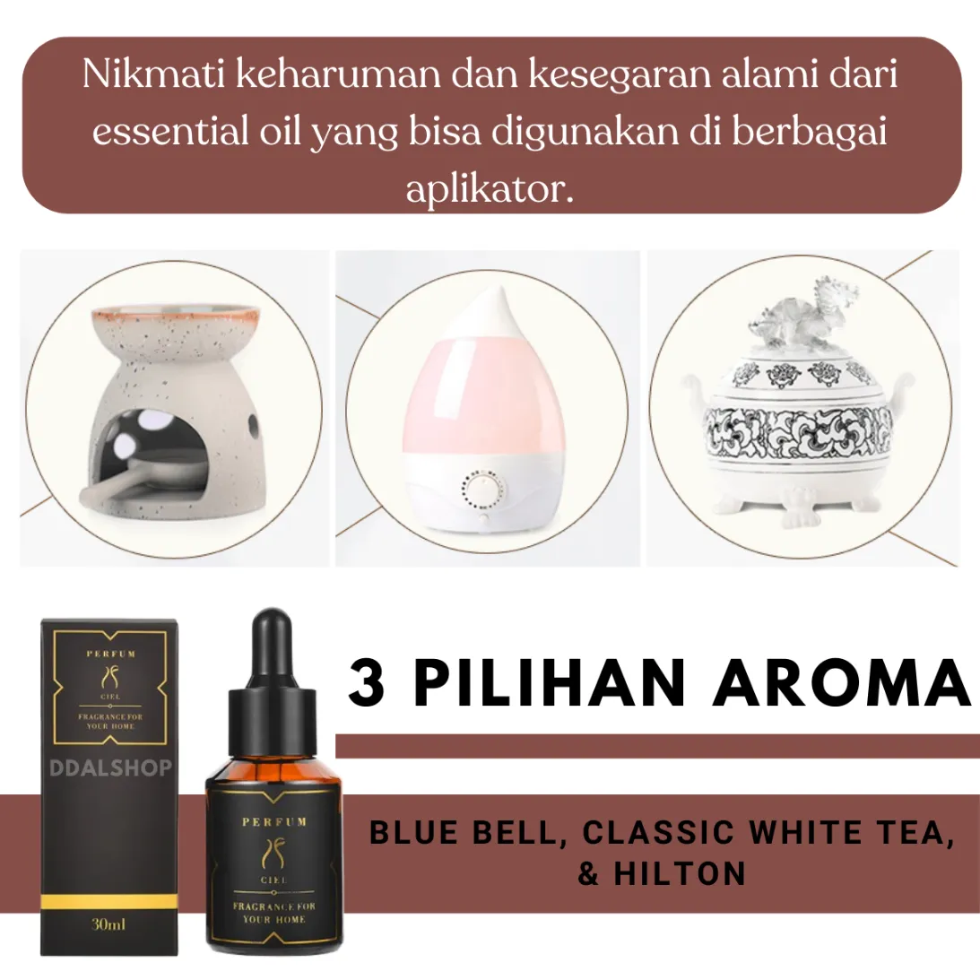 Dilengkapi manik-manik kayu khusus yang mudah menyerap minyak esensial, aroma akan menyebar secara perlahan dan tahan lama ke seluruh sudut ruangan. Tersedia dalam tiga warna aesthetic (Biru, Pink, dan Abu-abu) serta pilihan aroma premium seperti The Earth, English Oak, Classic White Tea, Hilton, Mediterranean Garden, dan Blue Campanula — memberikan sensasi keharuman yang elegan dan berkualitas hotel.