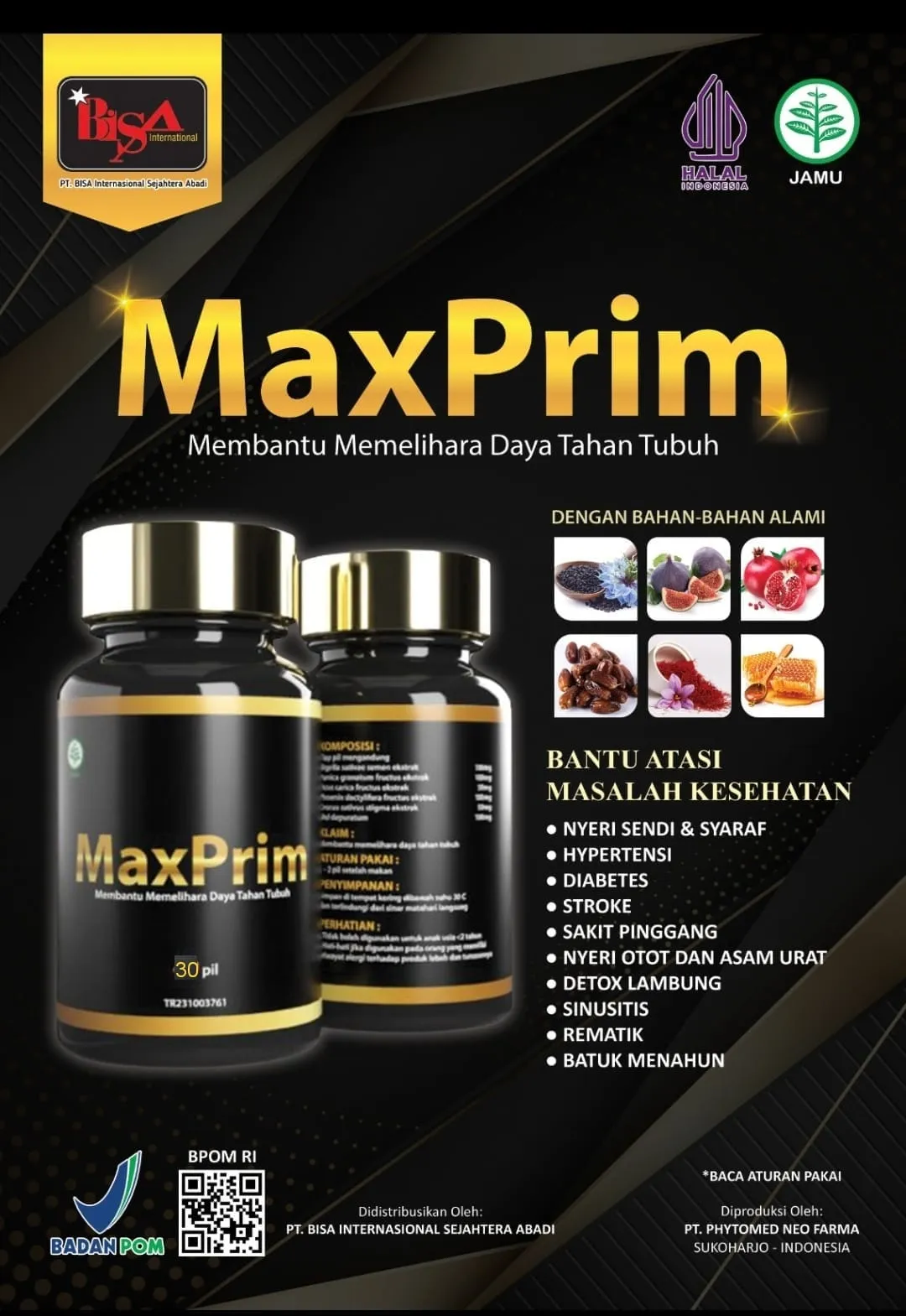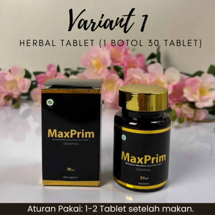 MaxPrim adalah pil hitam herbal premium dengan kandungan Buah Tin, Saffron, Kurma Ajwa, Madu Yaman, Delima, dan Habatussauda yang dipercaya membantu: