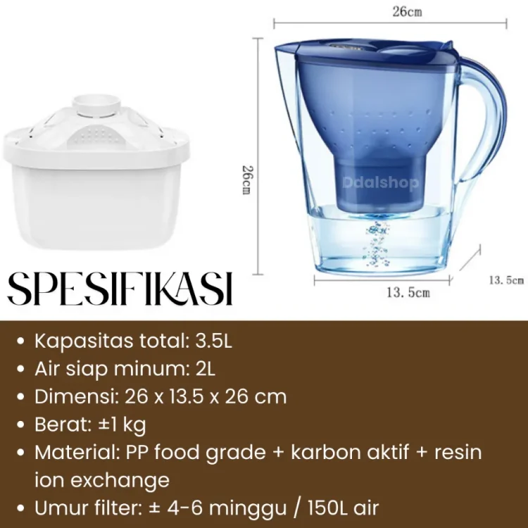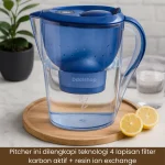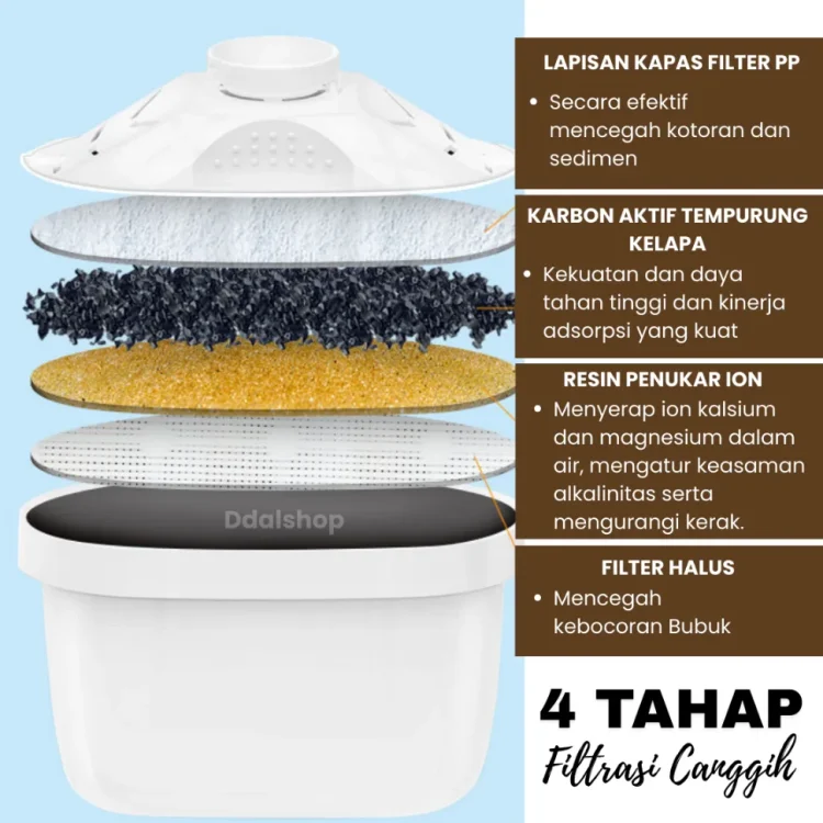 Pitcher penyaring air minum kapasitas 3.5 liter ini hadir dengan 4 tahap filtrasi canggih (karbon aktif + resin ion exchange) yang mampu menyaring klorin, karat, endapan halus, logam berat berbahaya, bau tak sedap, hingga sisa pestisida.