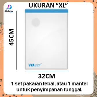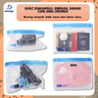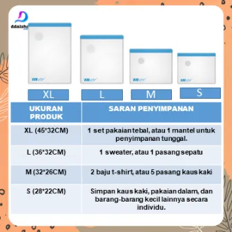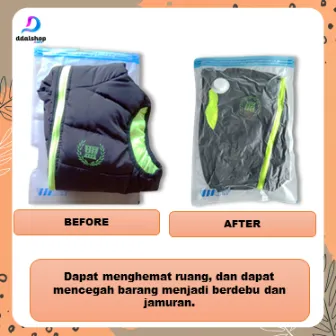 Dengan material berkualitas PA+PE, kantong vakum ini tahan lama, anti bocor, dan memiliki segel otomatis yang menjaga pakaian tetap terlindungi dari debu, kelembaban, dan jamur. Tersedia dalam berbagai ukuran, kamu bisa menyimpan mulai dari kaus kaki, pakaian dalam, hingga jaket tebal dan sepatu.