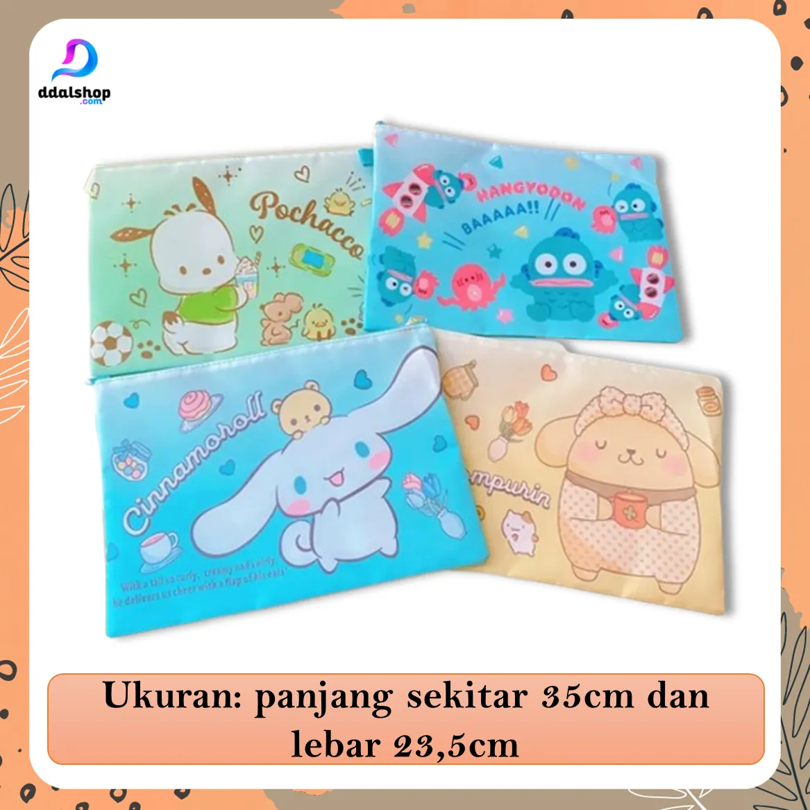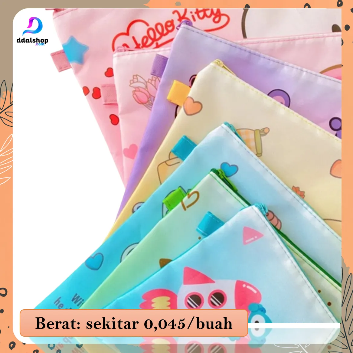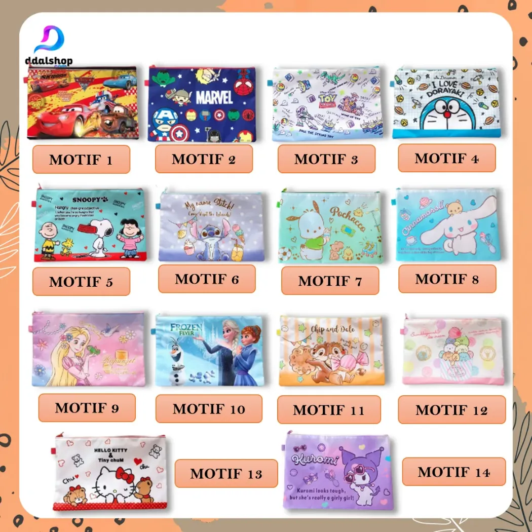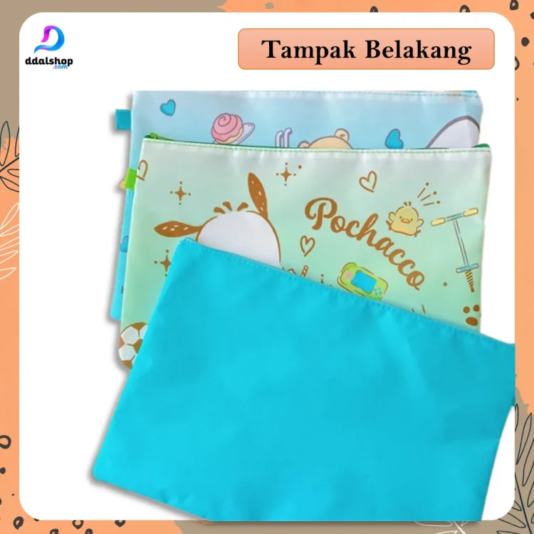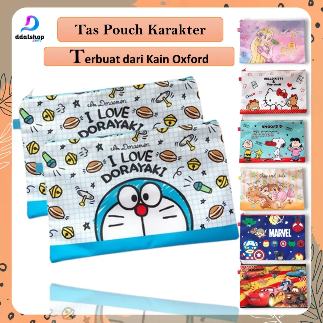 Pouch Bag File Folder A4 berbahan Oxford tahan air dengan motif karakter Doraemon, Marvel, dan lainnya. Muat buku, dokumen, dan ATK dengan resleting halus & kuat. Cocok untuk sekolah, kuliah, maupun kerja.