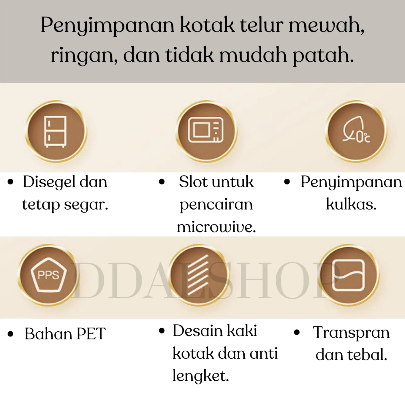 Anti pecah, ringan, dan tahan lama. Aman digunakan di kulkas, microwave (untuk pencairan telur beku), serta mudah dibersihkan. -