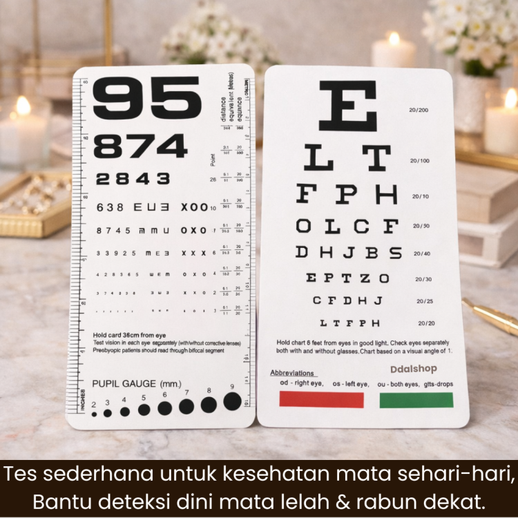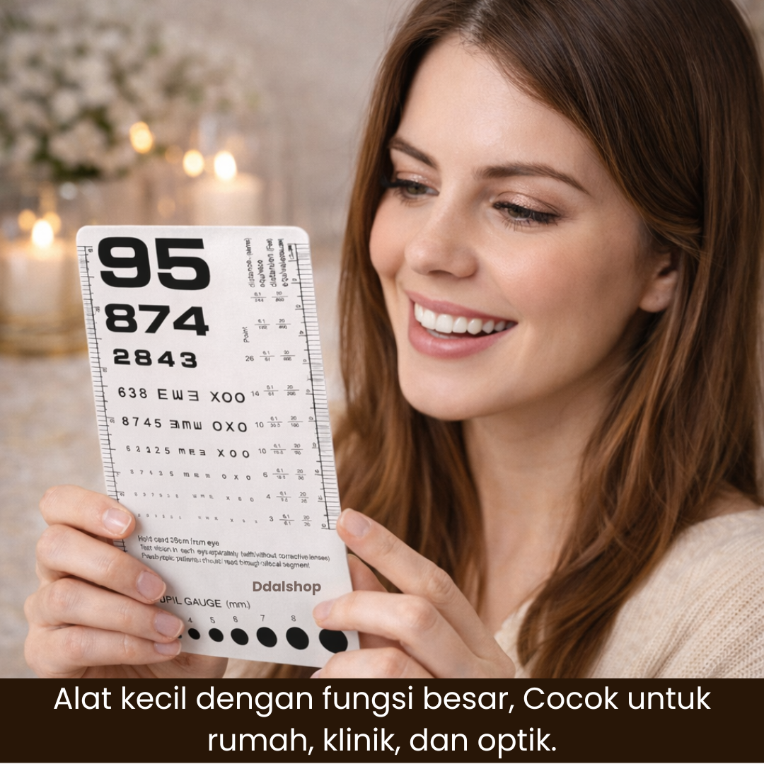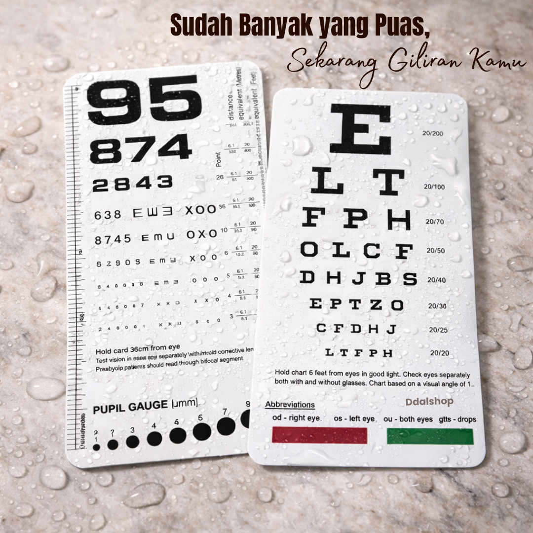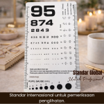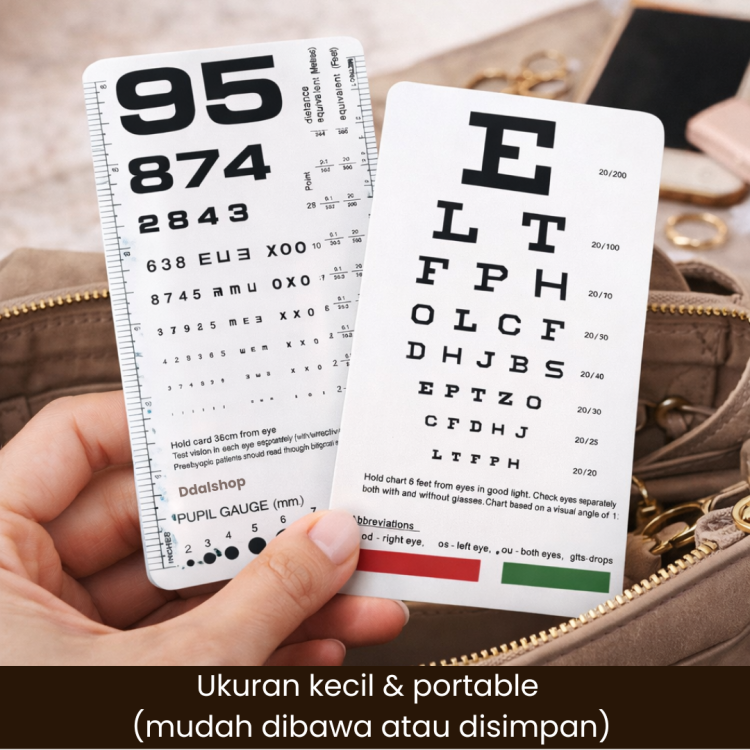 Dengan ukuran 6.5 x 3.5 inch , kartu ini ringan, mudah dibawa, dan tidak memakan tempat. Cocok digunakan oleh klinik mata, dokter umum, perawat, mahasiswa kedokteran , maupun untuk pemeriksaan mata mandiri di rumah.