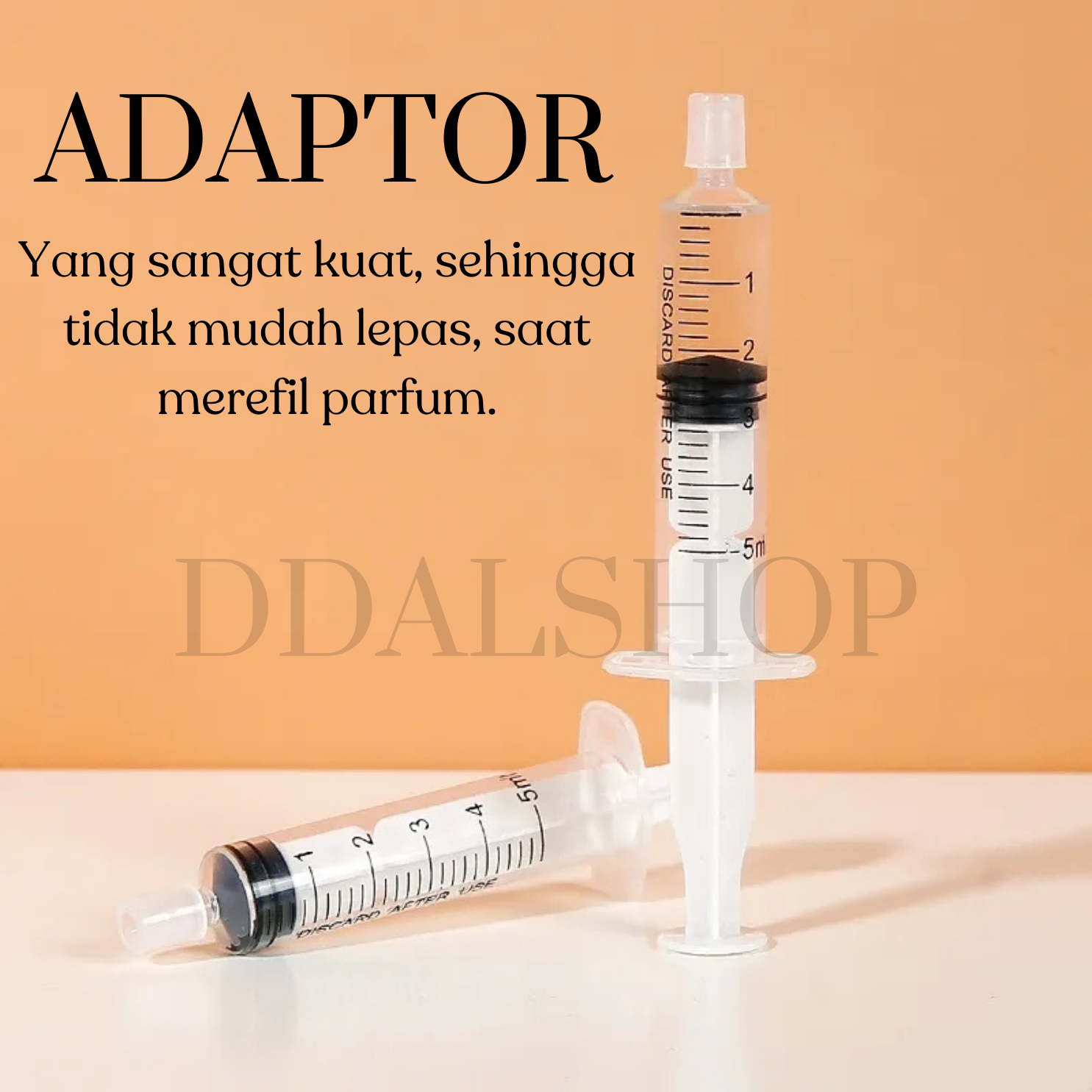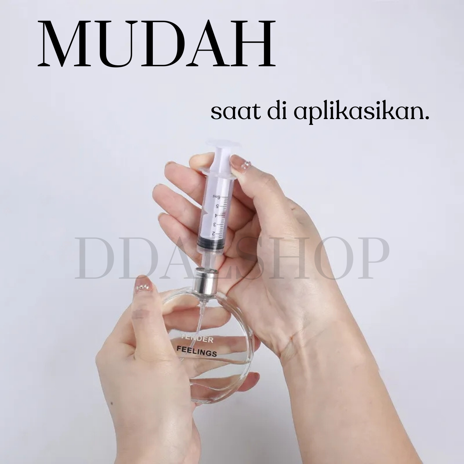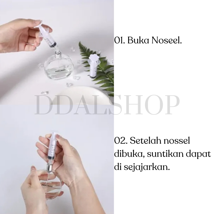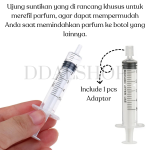 Suntikan parfum ini dirancang khusus untuk memudahkan Anda memindahkan parfum dari botol utama ke botol refill dengan cepat dan rapi. Dilengkapi ujung suntikan yang menempel kuat pada nosel parfum sehingga proses transfer lebih aman dan tidak mudah bocor.