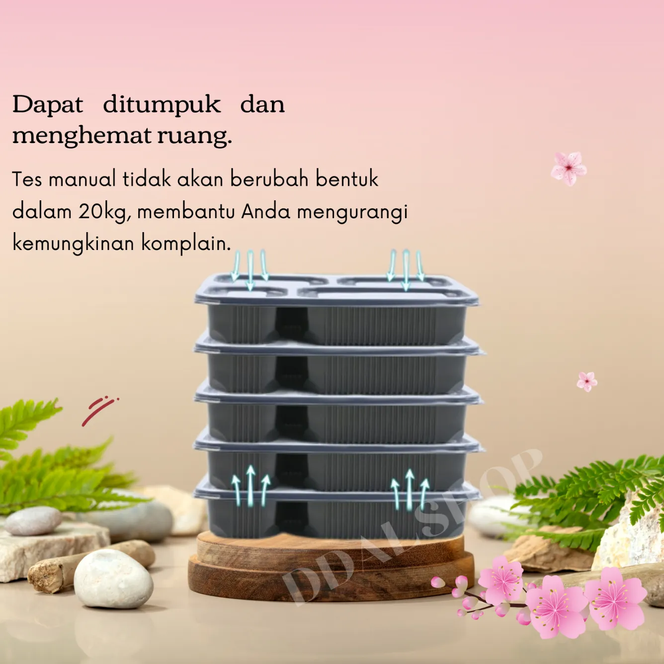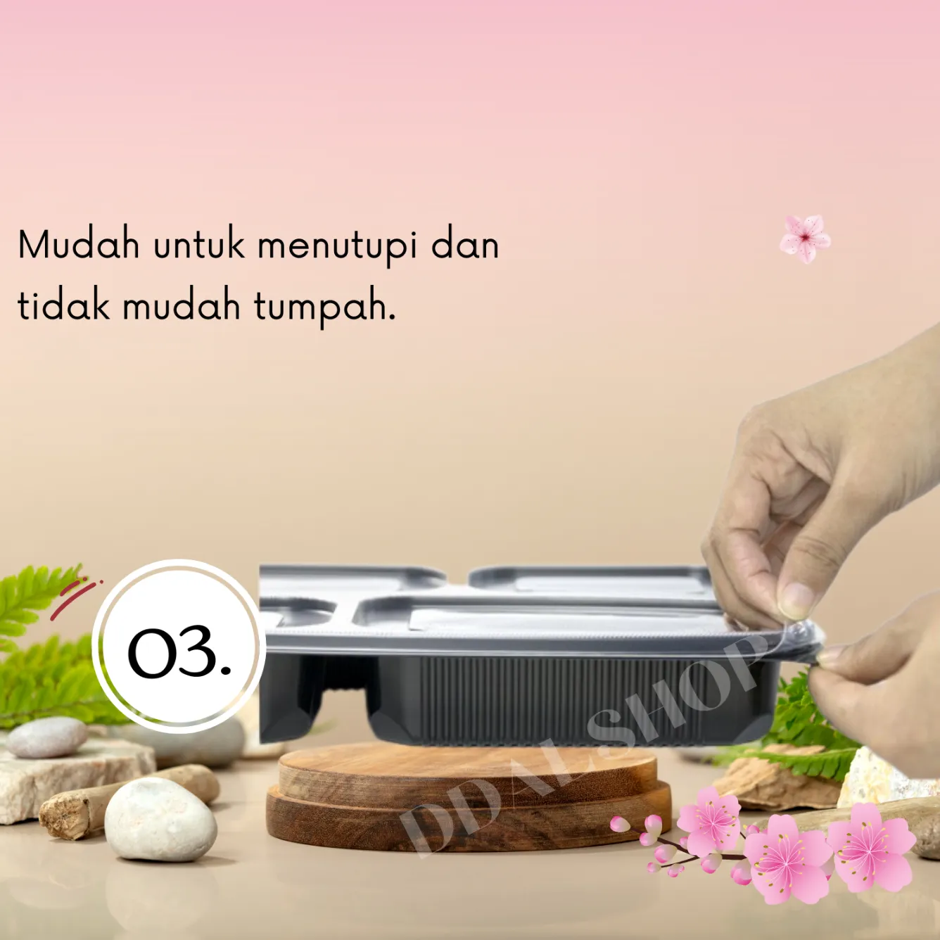 Dilengkapi dengan 4 sekat terpisah, box bento ini memudahkan Anda untuk memisahkan lauk, nasi, sayur, dan camilan agar tetap terjaga rasa serta tampil menarik. Tersedia dalam 3 pilihan warna elegan: transparan, putih, dan hitam.