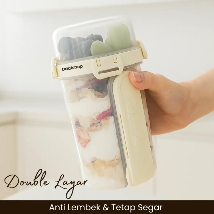 Tempat Salad Portabel Double Layer ini adalah solusi praktis untuk Anda yang ingin menjalani pola hidup sehat tanpa ribet. Dirancang dengan desain lapis ganda (double layer), cup ini mampu memisahkan salad, buah, yogurt, granola, saus, hingga camilan agar tetap segar, tidak lembek, dan tidak bercampur sebelum dimakan.