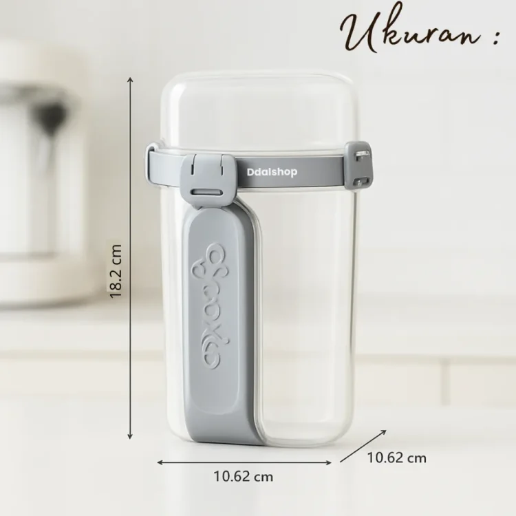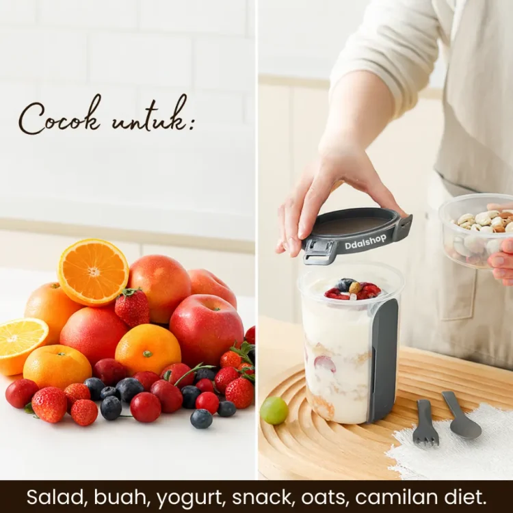 Desainnya ringan, anti tumpah, dan mudah dibawa, sangat cocok digunakan sebagai wadah meal prep diet, bekal kantor, sekolah, gym, piknik, maupun traveling. Kapasitasnya cukup besar dan multifungsi untuk salad diet, buah potong, yogurt granola, overnight oats, snack sehat, hingga bekal anak.