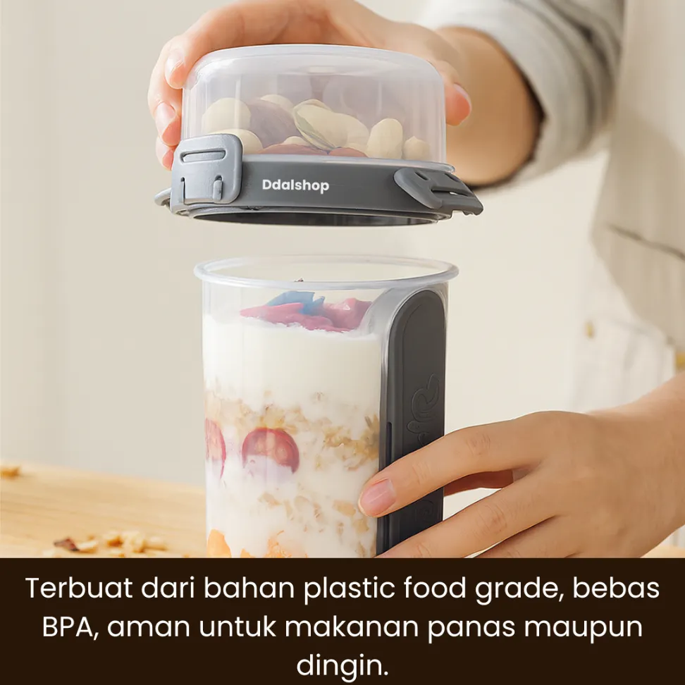 Desainnya ringan, anti tumpah, dan mudah dibawa, sangat cocok digunakan sebagai wadah meal prep diet, bekal kantor, sekolah, gym, piknik, maupun traveling. Kapasitasnya cukup besar dan multifungsi untuk salad diet, buah potong, yogurt granola, overnight oats, snack sehat, hingga bekal anak.
