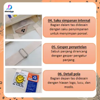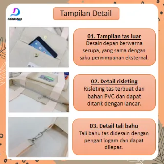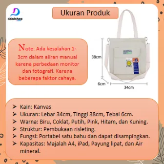 Dengan ukuran 38 x 6 x 34 cm, tas ini memiliki kapasitas luas yang mampu menampung berbagai barang seperti handphone, botol minum, buku, hingga payung lipat. Dilengkapi dengan ritsleting aman, tali selempang yang dapat disesuaikan, serta saku depan dan saku dalam untuk menyimpan barang kecil agar lebih rapi.