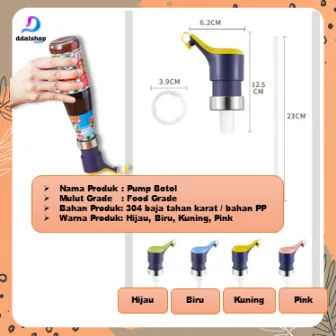 Tutup Botol Press Pump untuk saus, kecap, sirup, atau minyak. Anti bocor, higienis, dan mudah digunakan. Material 304 stainless steel + PP, tekan sekali ±8ml, cocok untuk botol diameter 2.8–3.4cm. Tersedia 4 warna & 2 varian cincin (PP/Stainless).